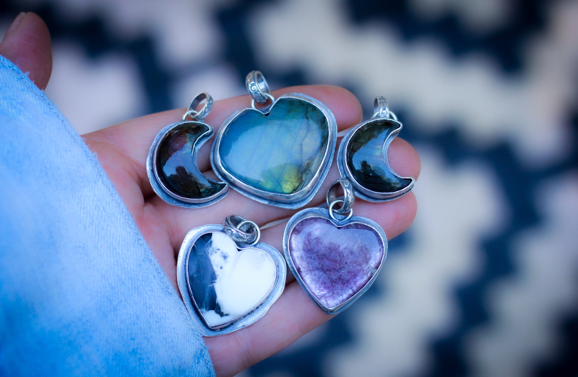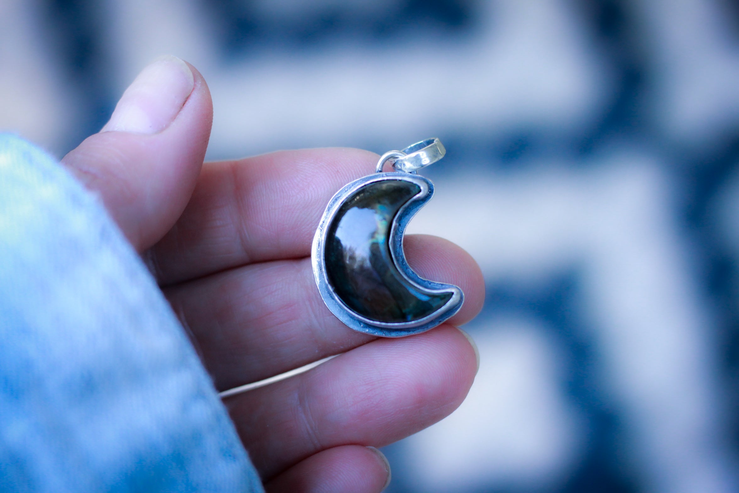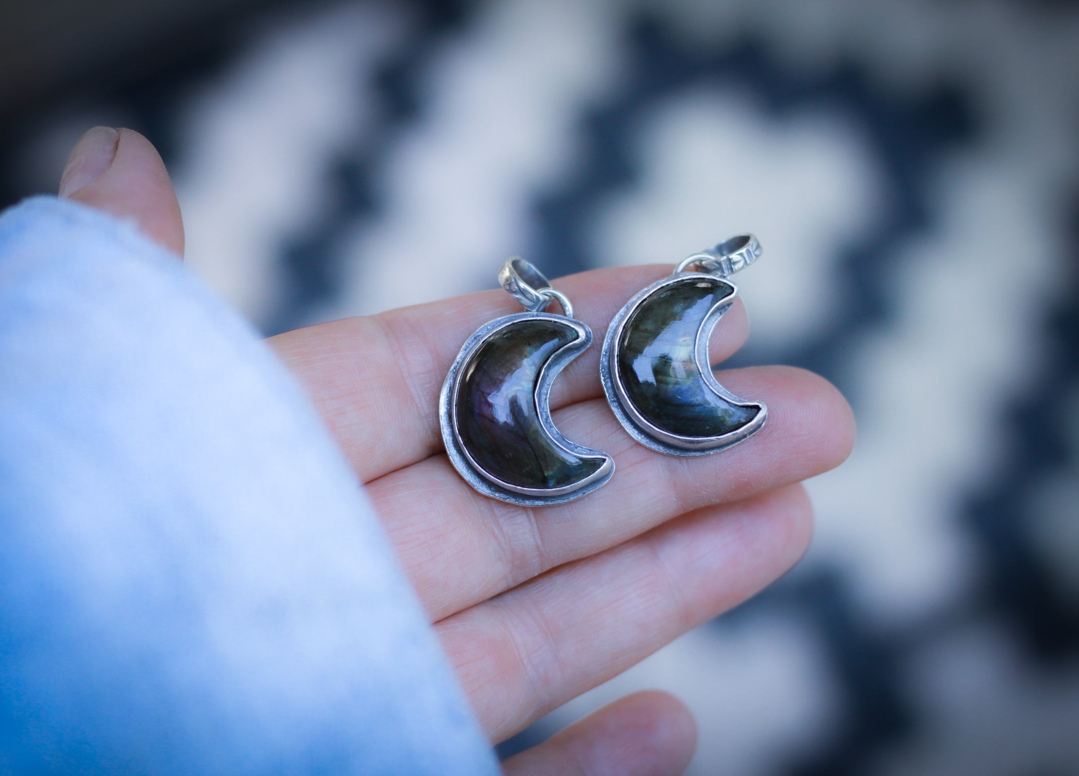 A purple grey labradorite moon charm handcrafted in fine and sterling silver.