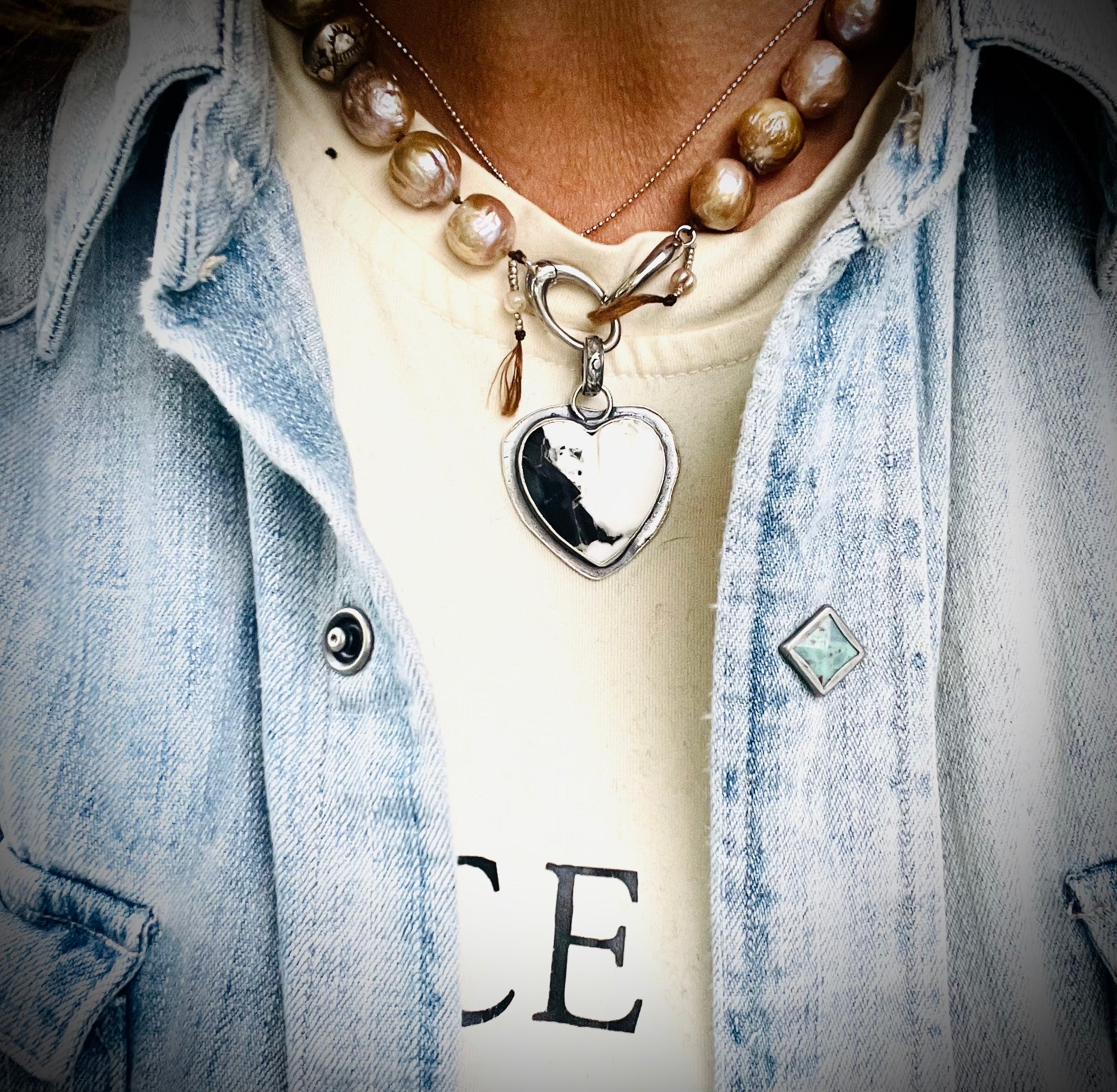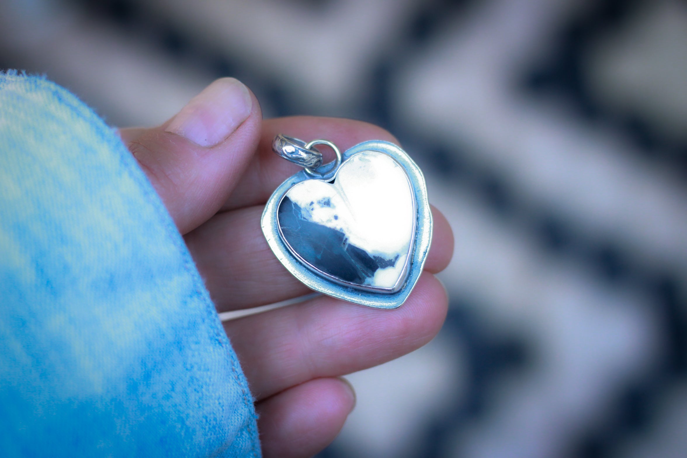 A gorgeous white buffalo carved heart set in recycled fine and sterling silver. This piece measures 1.5 inches by 1.2 inches wide.