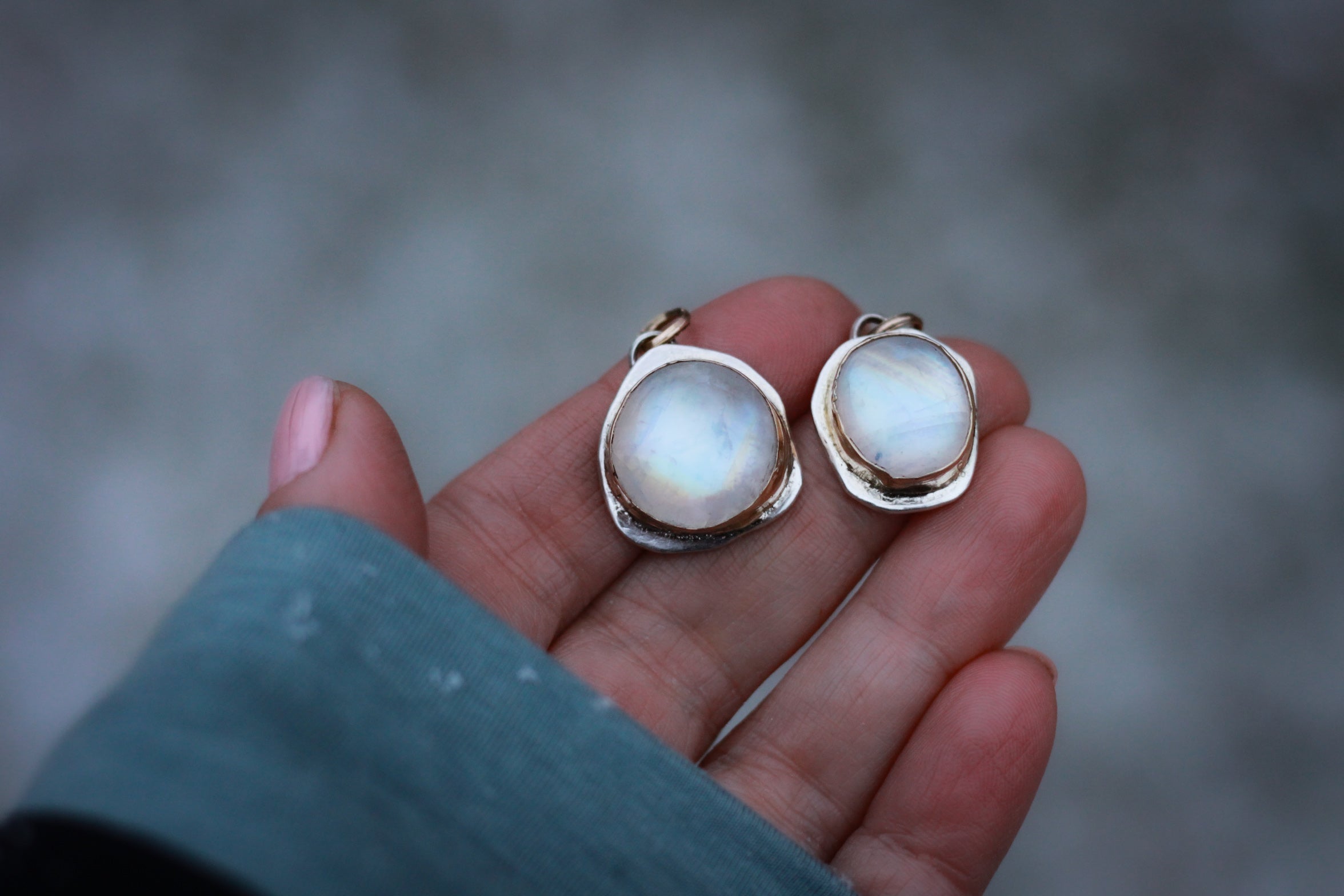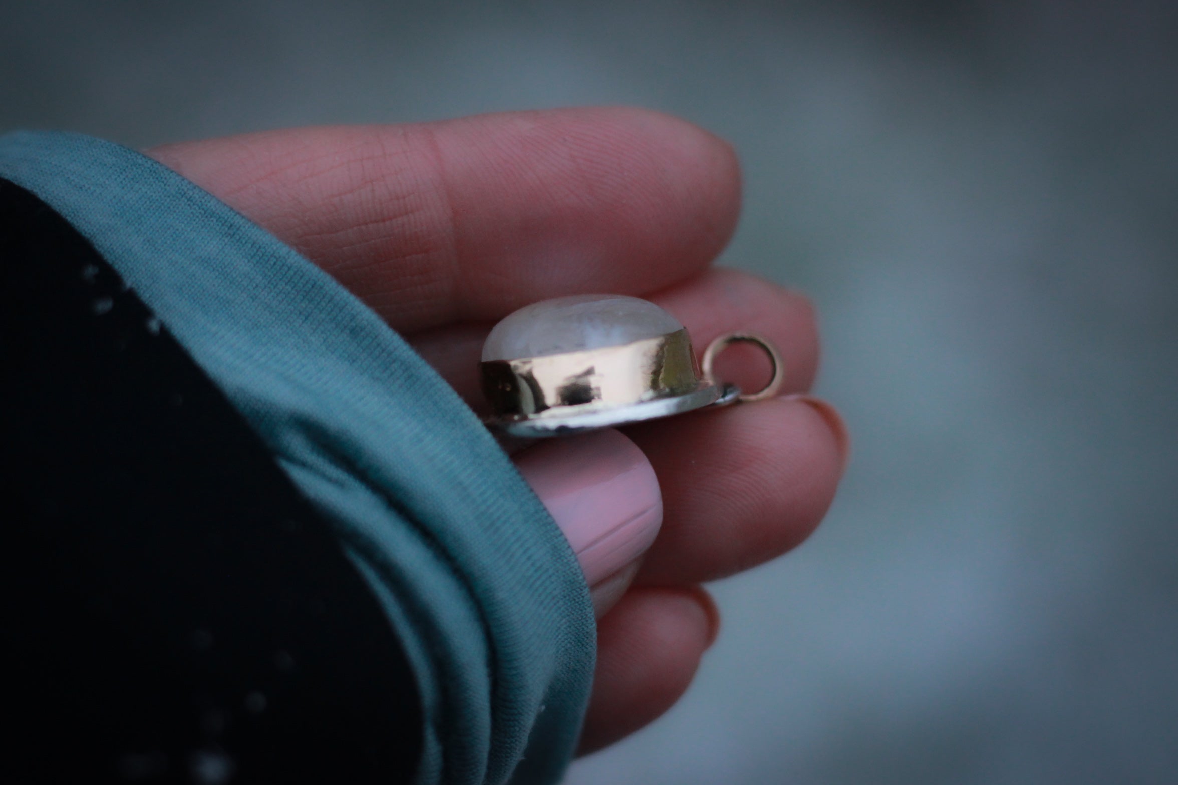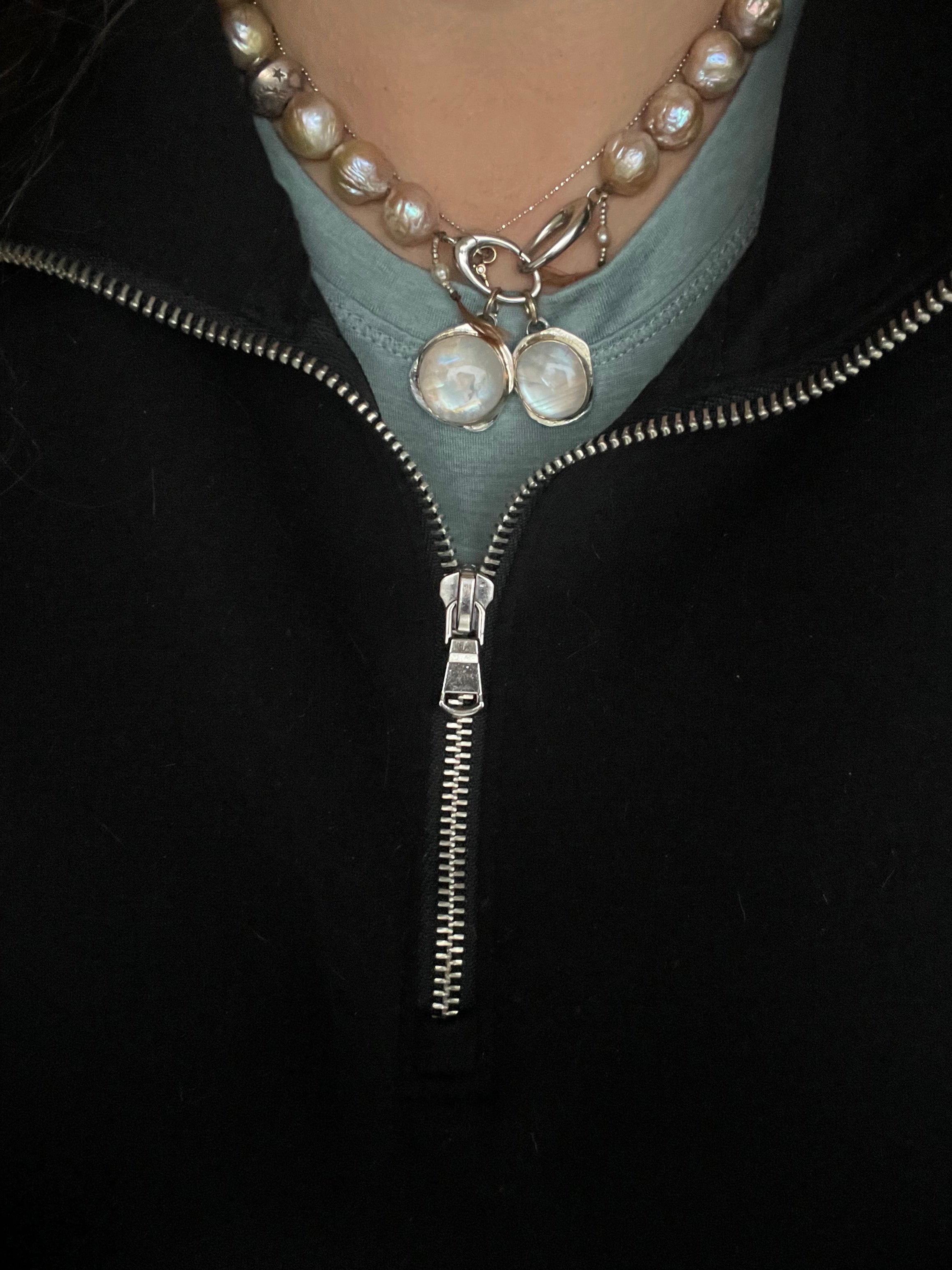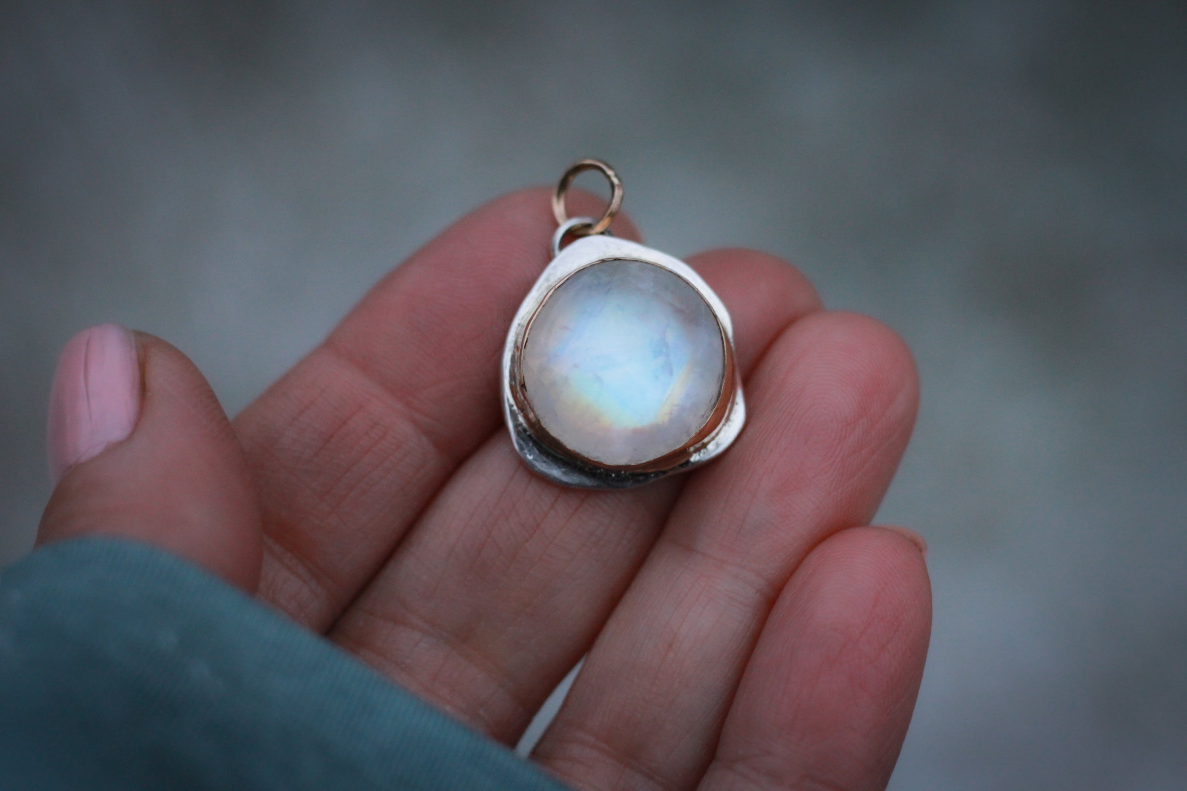 A stunning drop of high domed moonstone on a thick bed of fine silver with a solid thick 14k yellow gold bezel that means .25 inches in height with a 14k yellow gold loop. The pendant measures 7/8 of an inch. It is fine heirloom quality and built to last a lifetime.