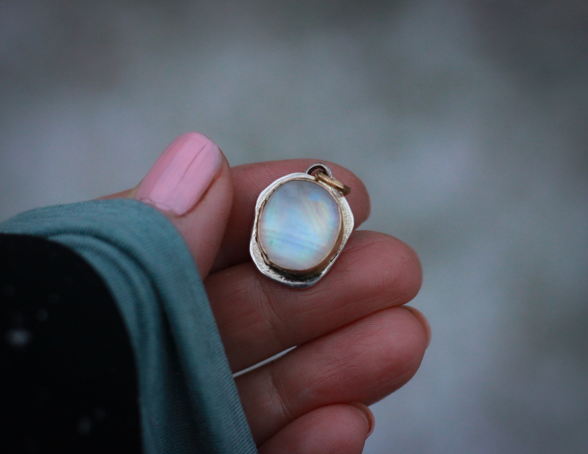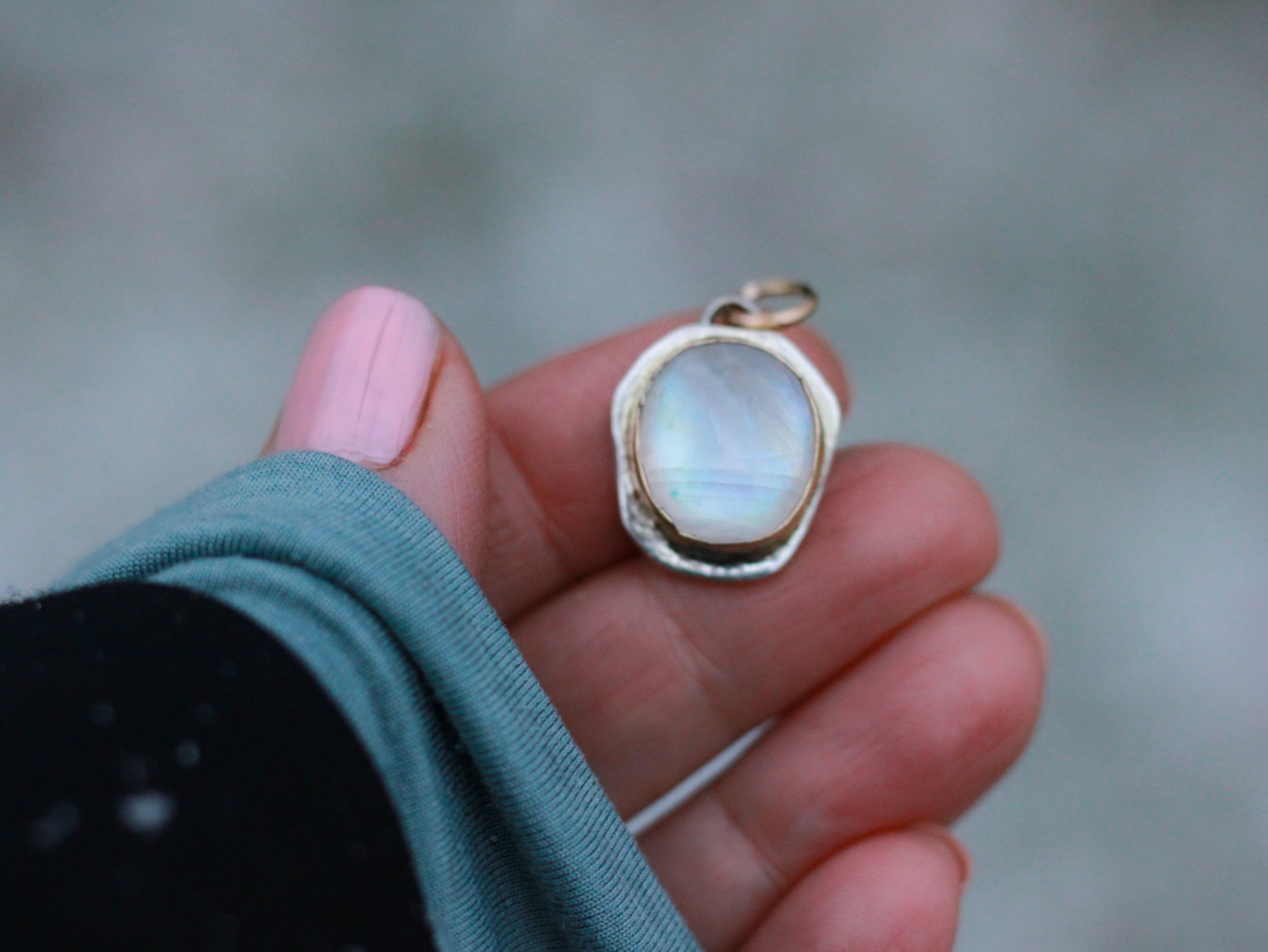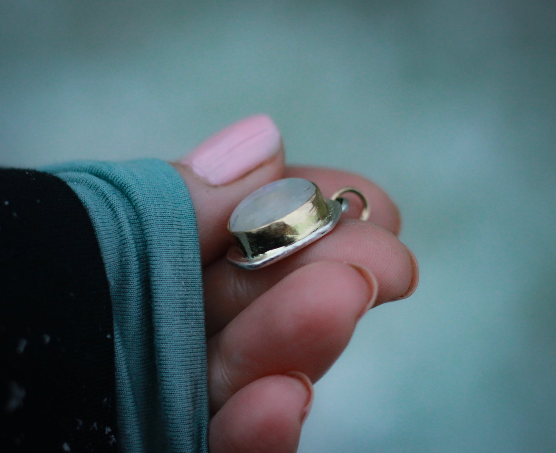 A stunning drop of high domed moonstone on a thick bed of fine silver with a solid thick 14k yellow gold bezel that means .25 inches in height with a 14k yellow gold loop. The pendant measures 3/4 of an inch in length. It is fine heirloom quality and built to last a lifetime.